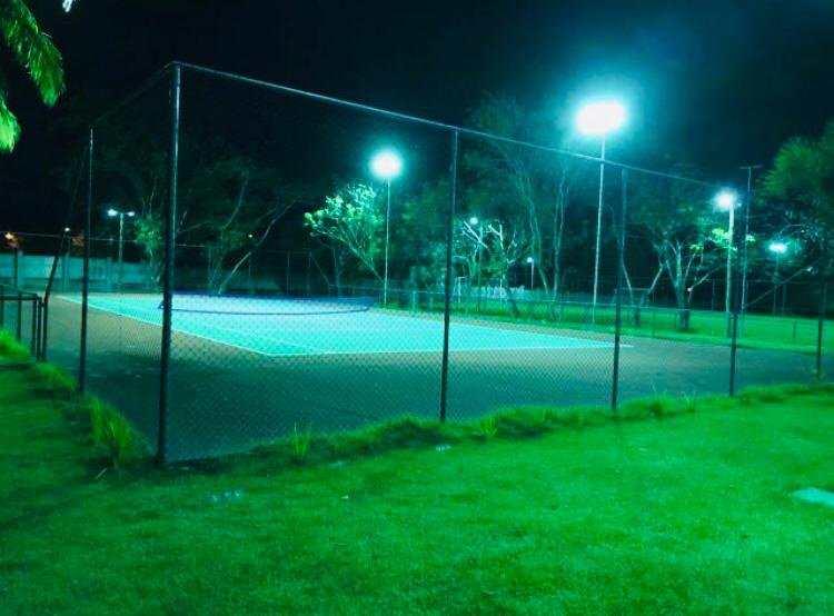 Playground infantil, campo de futebol society, quadras poliesportiva, de tênis e vôlei de areia;
